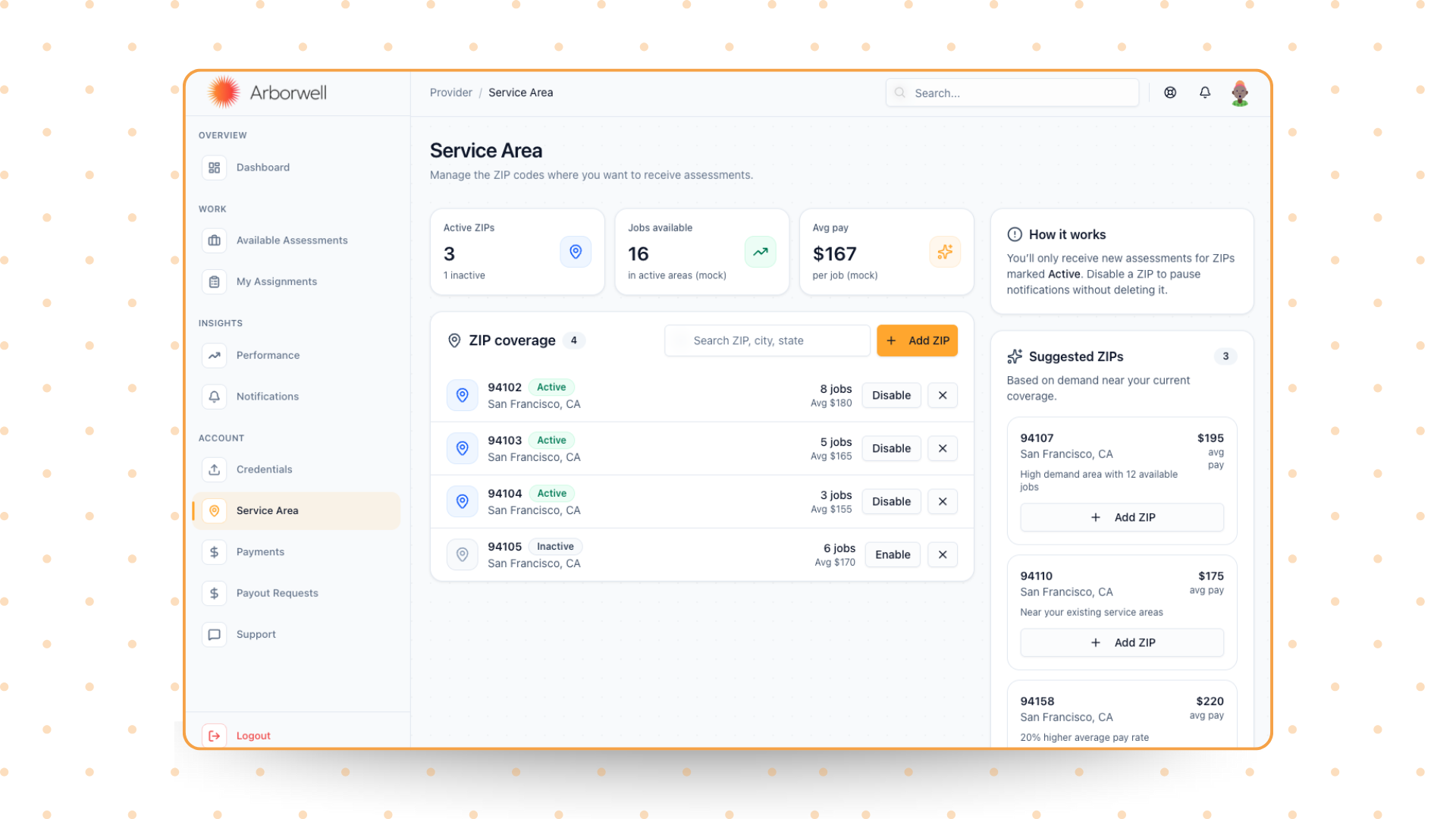 - Established ZIP code-based service area management for targeted job distribution